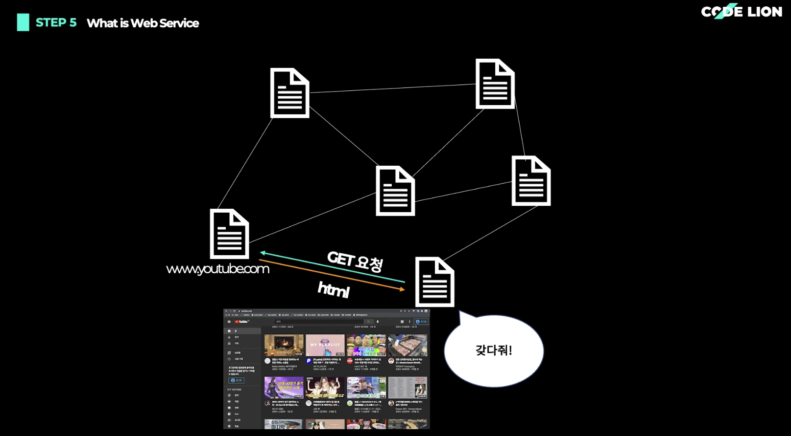 그에 대한 응답으로 유튜브 흠페이지가 html파일로 돌아오는 이러한 과정을 GET요청이라고 한다.