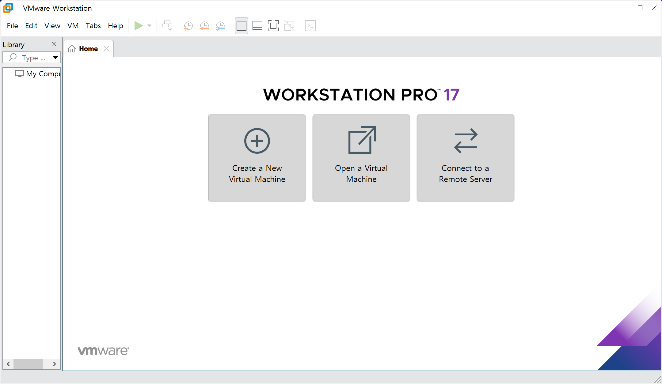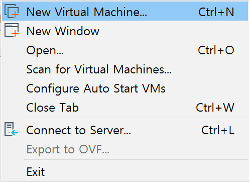 여기서 Create a New Virtual Machine을 눌러도 되고, 상단 File을 누르면