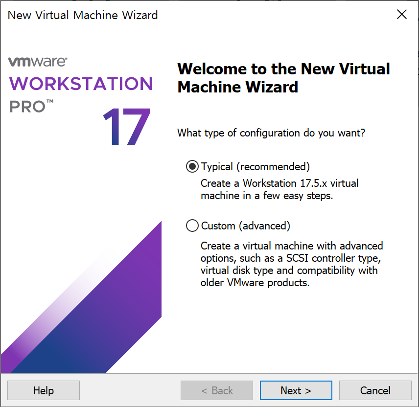 이렇게 New Virtual Machine.. 을 눌러도 무방하다. 여튼 누르게 되면 아래와 같은 창이 뜬다.